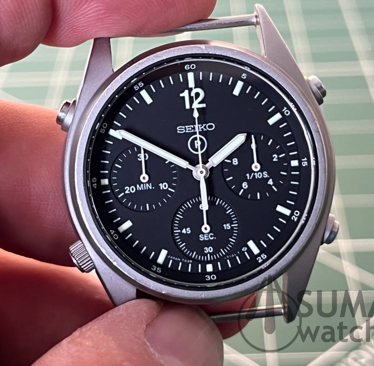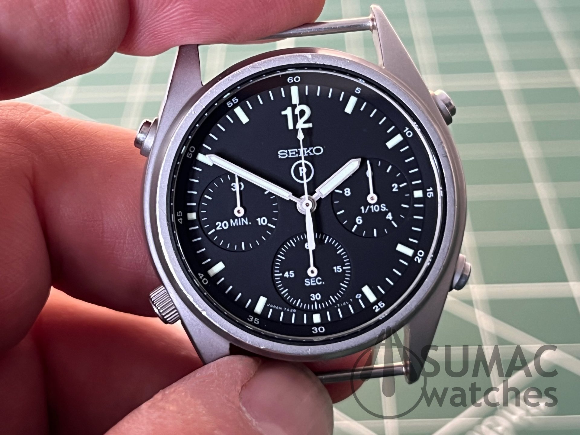 The Seiko 'Gen 1' was the first quartz chronograph issued by UK armed forces. The 7A28 movement - the world's first analogue quartz chronograph - is a fantastic piece of engineering. Apart from two plastic spacer plates, all components are metal and the watch can be fully stripped and serviced for long-term maintenance. The watch includes a trimmer so it can be adjusted for accuracy, but the increments of adjustment are quite coarse, so the degree of accuracy obtainable varies slightly from watch to watch. However, accuracy well within the original +/- 10 seconds per month specification is almost always achievable.