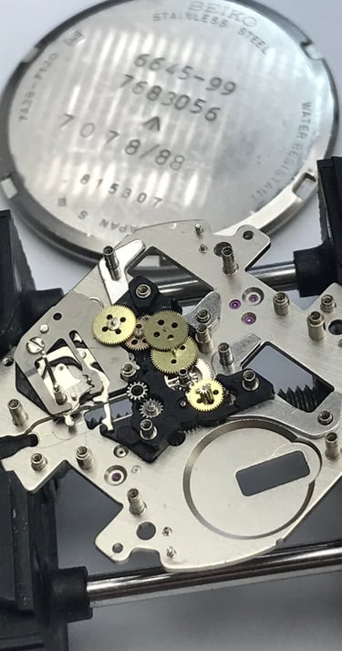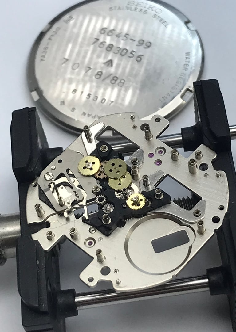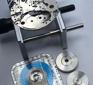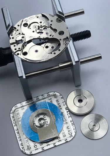 Once works are agreed the case parts and movement are stripped. The case parts are ultrasonically cleaned, the movement parts are ultrasonically and mechanically cleaned in waterless solutions and hot air dried. The movement is then rebuilt and lubricated. For mechanical watches we generally use a new mainspring where available, to ensure the best performance for the watch. Once the movement is rebuilt it is tested to ensure complications such as chronograph or calendar works are operating correctly. The movement is then regulated for accuracy. Quartz movements are regulated for accuracy where the circuit board supports this adjustment.